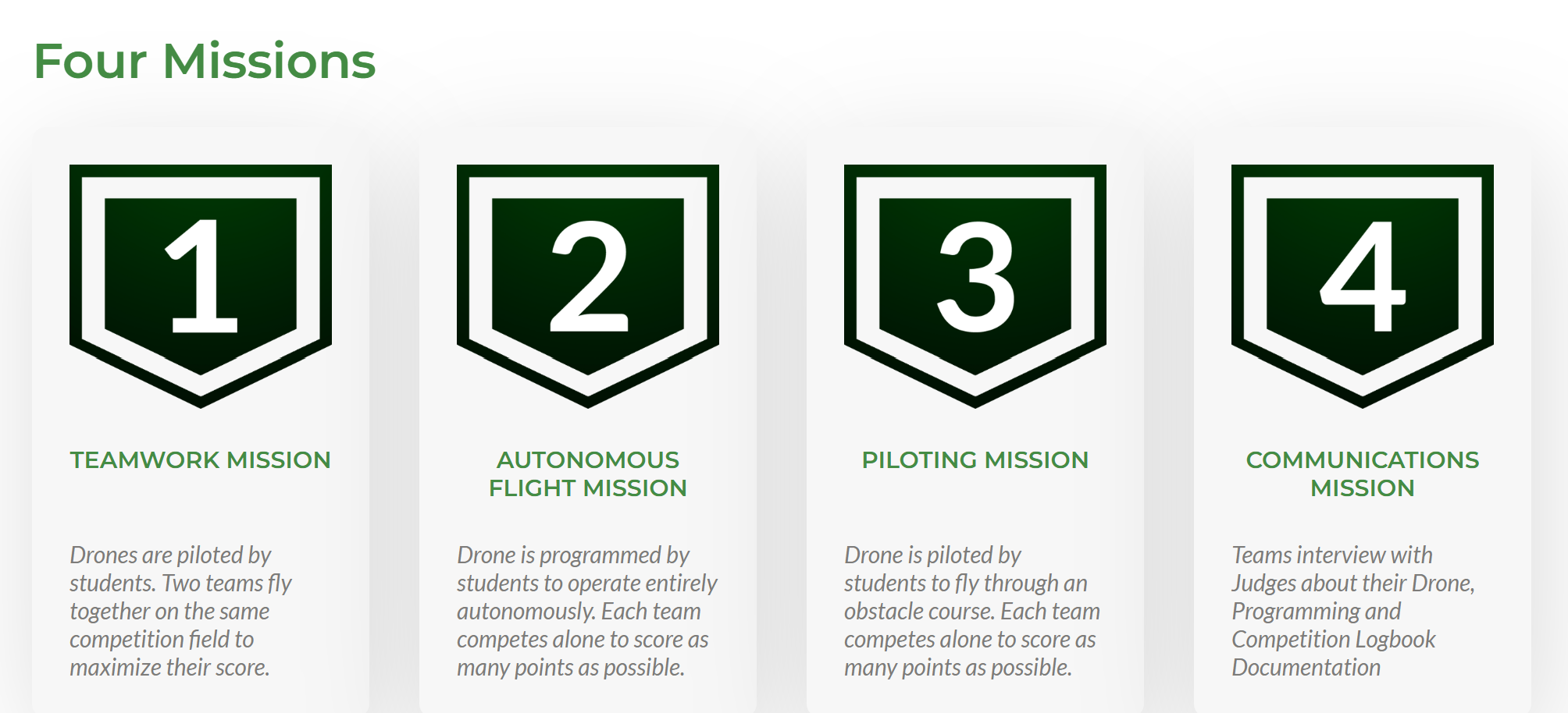 Each competition is graded on 4 missions: 1) Piloting, 2) Autonomous Flight, 3) Team Work, & 4) Communication