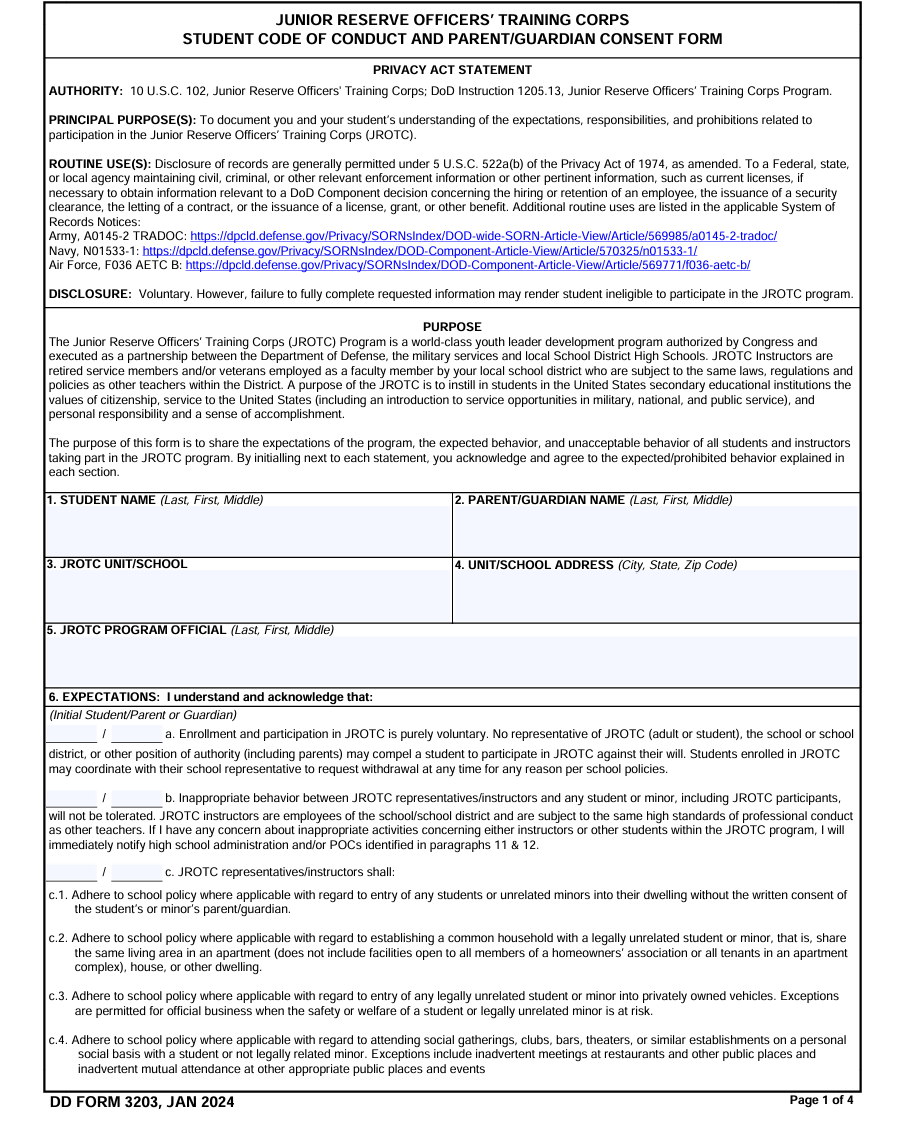 This Department of Defense (DoD) form is mandatory for students who want to participate in JROTC and become Cadets. Each student and parent/guardian must complete and sign the form and return it before entering the program. Cadets who do not return the form are subject to disenrollment from JROTC.